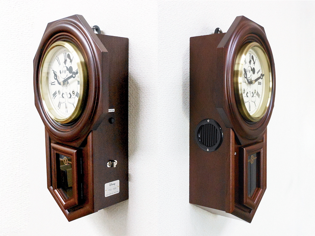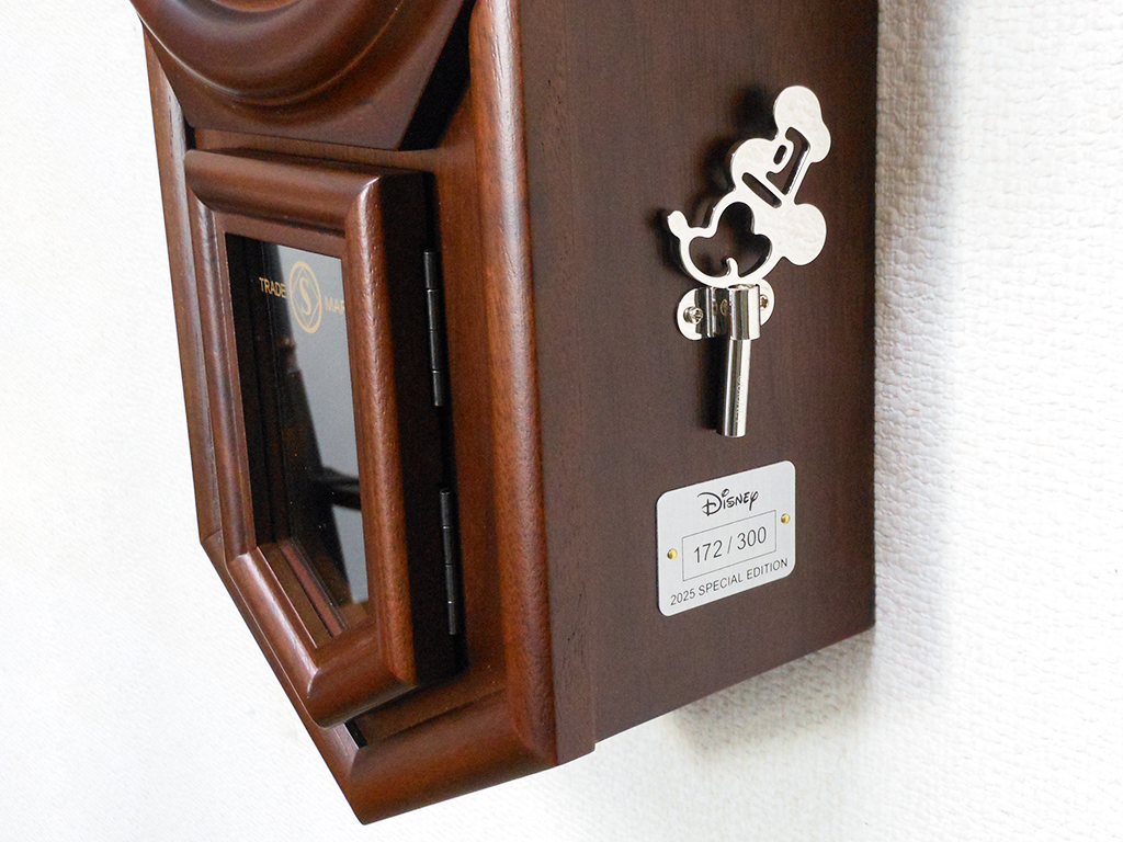 右側面に、昔懐かしいゼンマイ式掛け時計の巻き鍵(ミッキーのかたどり)を模した飾りを取り付けできるホルダーと限定シリアルナンバープレート。チャイムの音量調節時に便利なモニターボタン付き。