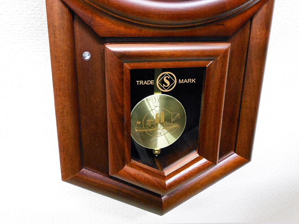 開閉可能な前面扉ガラスにSEIKO創業時の丸角Sマーク、飾り振り子には蒸気船がプリントされています。