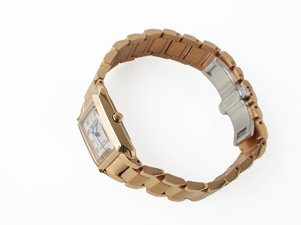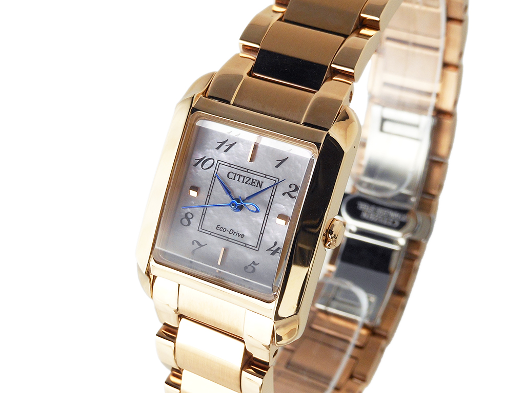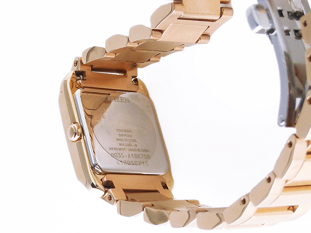 Cal.B035・光発電「エコ・ドライブ」・精度±15秒/月・光発電フル充電時約7ヶ月間持続駆動・厚み7.5mm・ケースサイズ横 21.5mm・ステンレスケース&バンド(ウォームゴールド色メッキ仕上げ)・両プッシュ観音開きタイプバンド中留・バンド幅16.0mm・バンド調整可能サイズ130~180mm・カーブカットサファイアガラス・5気圧防水・文字板部品:一部再生素材・白蝶貝文字板・充電警告機能・過充電防止機能・1年間メーカー保証(MY CITIZEN登録により2年間) ※重量、厚み、サイズは参考値。