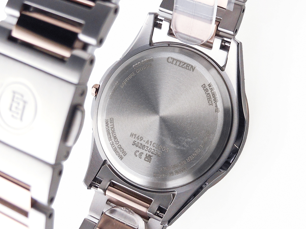 Cal.H149・光発電エコ・ドライブ・精度±15秒/月(非受信時)・持続時間 光発電約2年(パワーセーブ作動時)・日中米欧電波受信・重量62g・厚み8.5mm・ケースサイズ:横 38.0mm・スーパーチタニウムケース・ケース表面処理・デュラテクトプラチナ/デュラテクトサクラピンク(ライトシルバー色・サクラ色)・バンド素材:スーパーチタニウム・三ツ折れプッシュタイプバンド中留・バンド幅:19.0mm・バンド調整可能サイズ146~212mm・サファイアガラス(クラリティ・コーティング)・5気圧防水・耐ニッケルアレルギー・耐磁1種・白蝶貝文字板・充電残量表示機能・充電警告機能・過充電防止機能・パワーセーブ機能・フル充電時約2年可動(パワーセーブ作動時)・日中米欧電波受信・受信局自動選択機能・定時受信機能・強制受信機能・パーペチュアルカレンダー・日付表示・ダイレクトフライト・ワールドタイム機能(26時差)・サマータイム機能・パーフェックス(JIS1種耐磁、衝撃検知機能、針自動補正機能)・原産国:日本製・1年間メーカー保証(MY CITIZENご登録により2年間) ※重量、厚み、サイズは参考値としてご参照ください。※価格及び仕様は、予告なく変更する場合があります。
