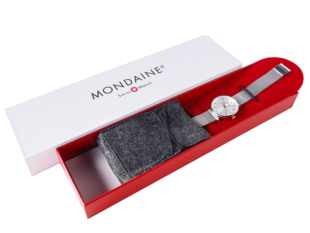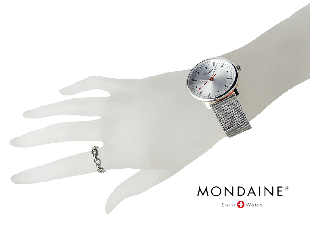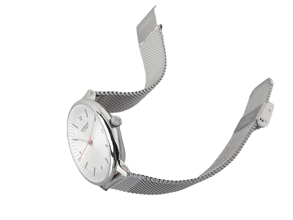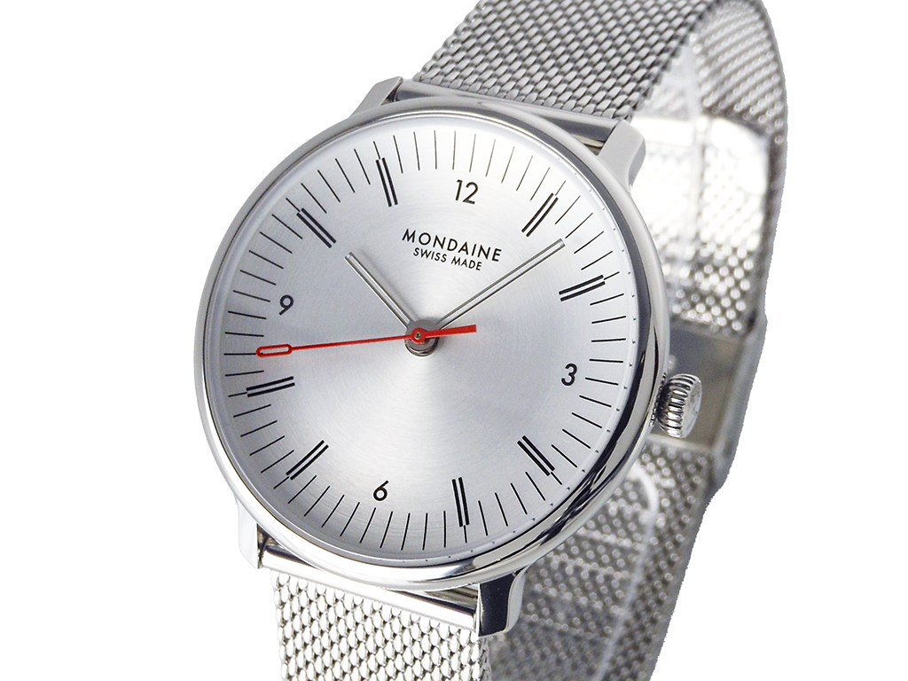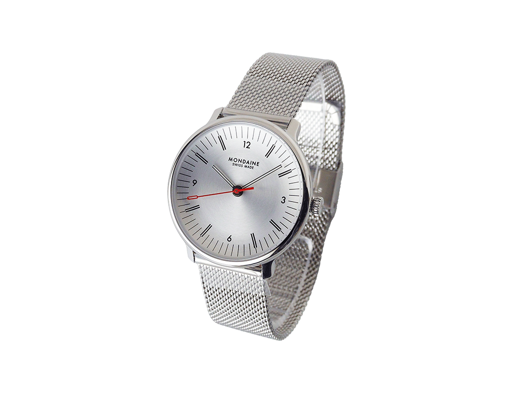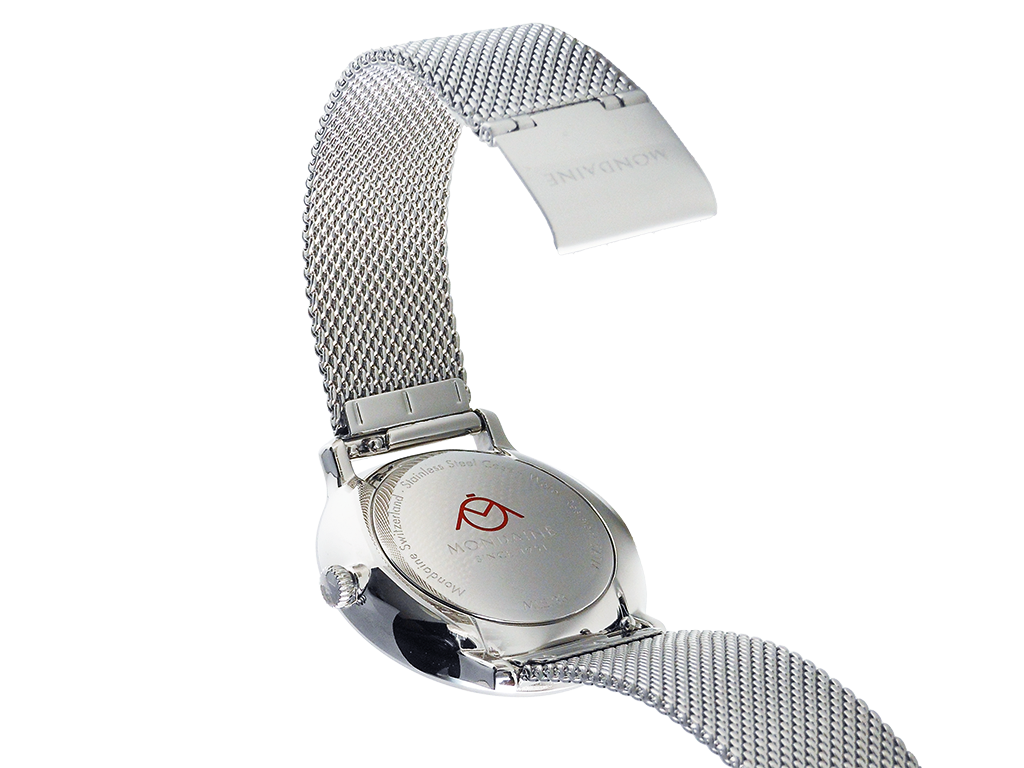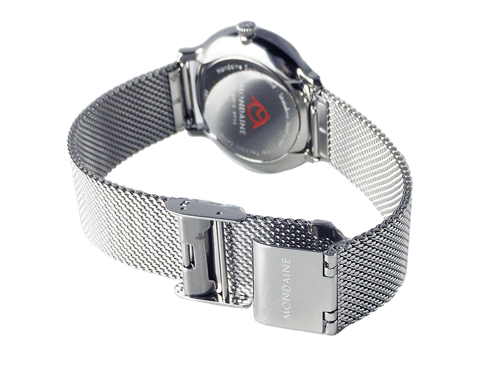 スッキリとした薄型、径:33ミリ、クォーツ、メッシュバンドモデル。
