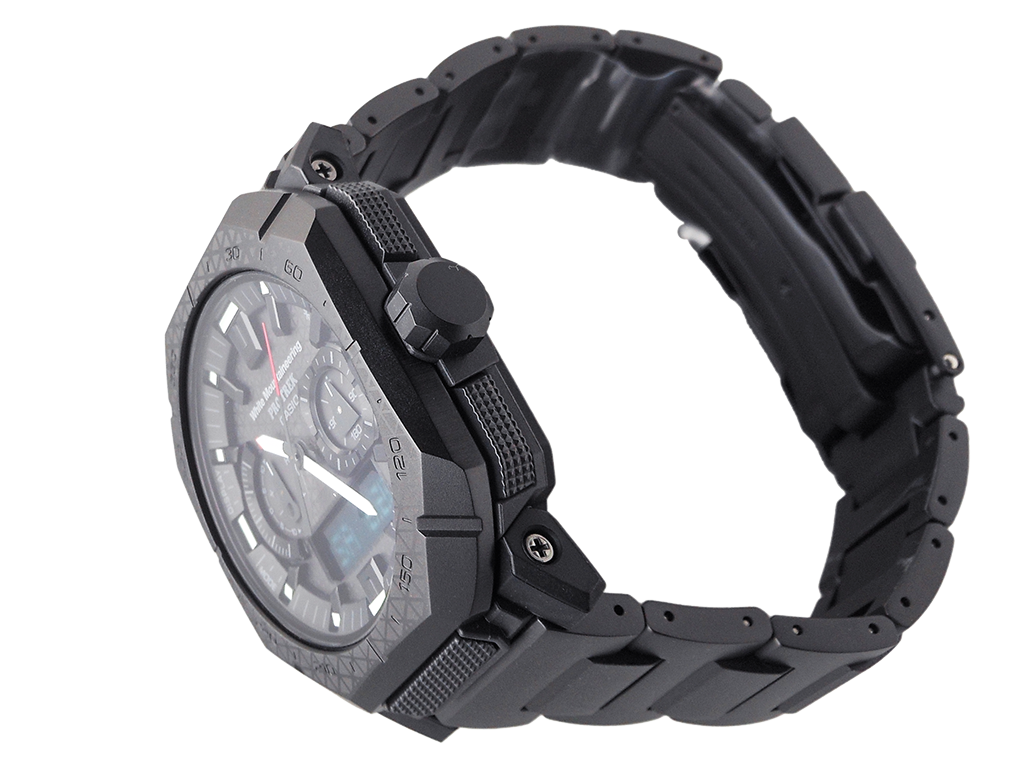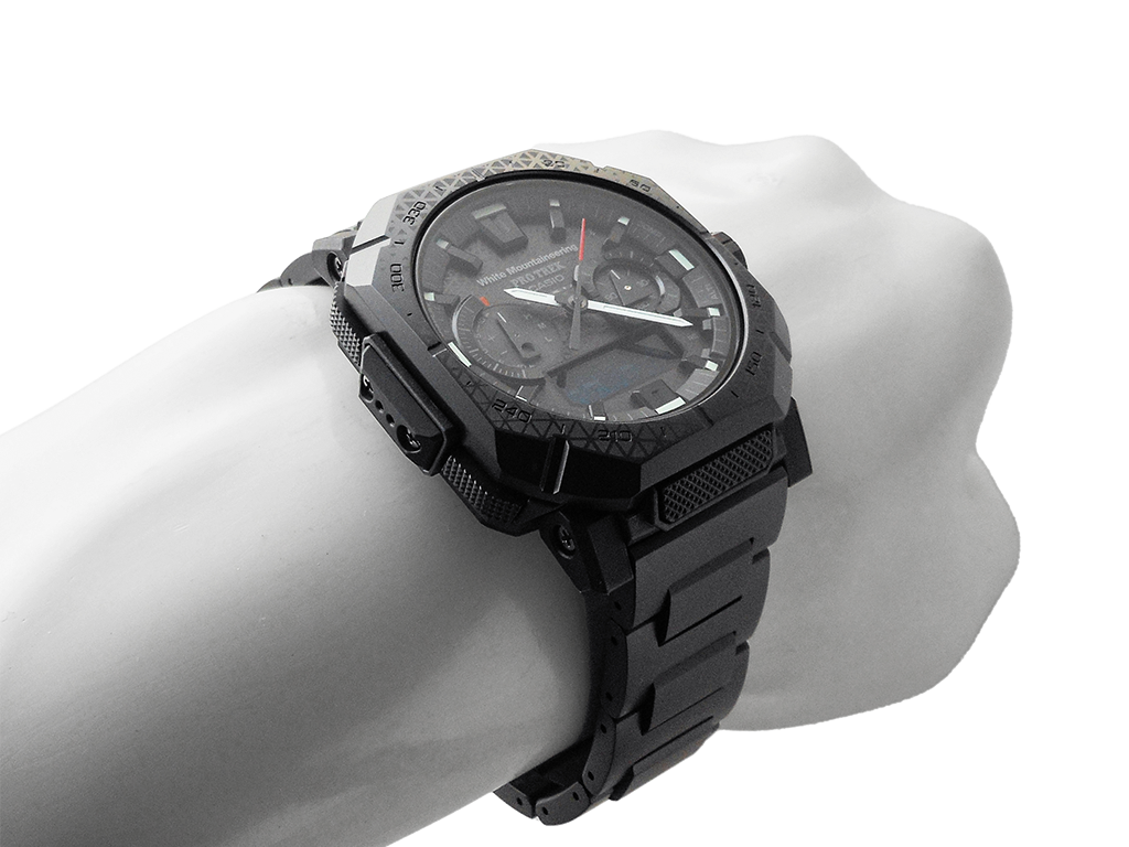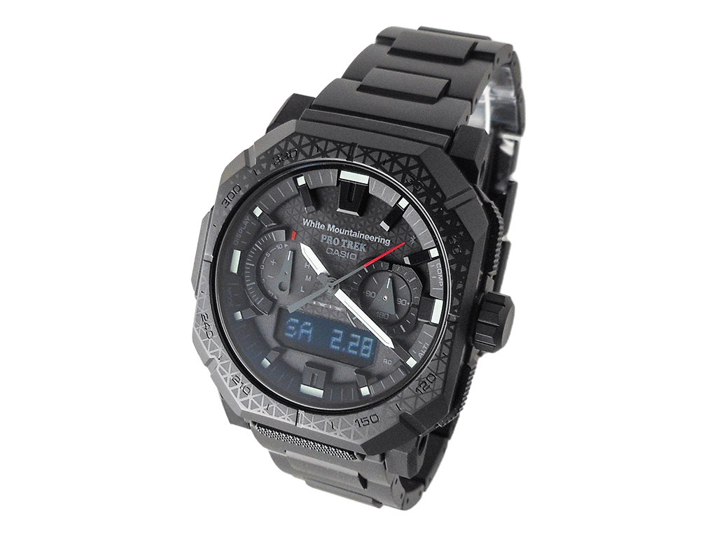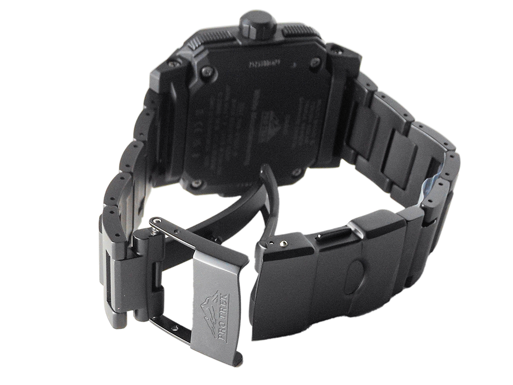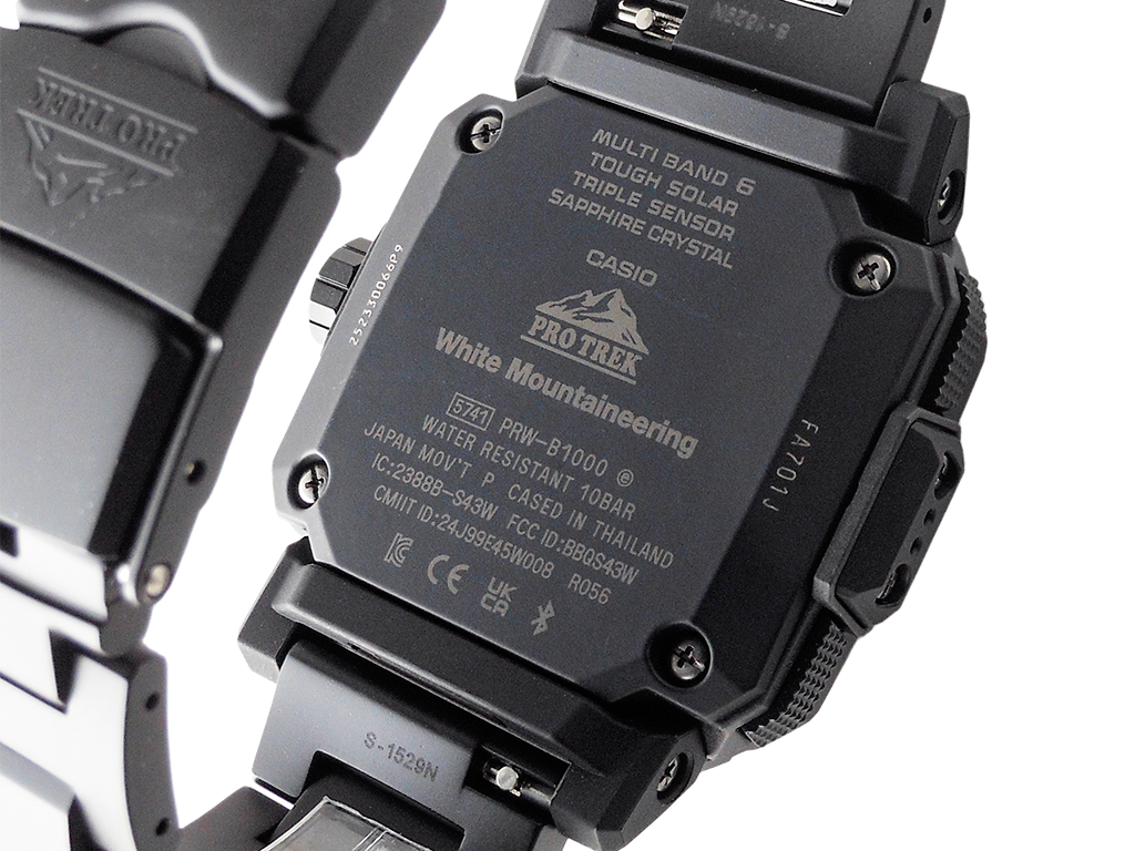 電波時計 日本・北米・ヨーロッパ・中国地域対応 MULTIBAND6・Bluetooth:スマートフォンと接続し時刻を自動修正・タフソーラー(ソーラー充電システム)・内面反射防止コーティングサファイアガラス・ねじロック式リューズ・表面加工:ブラックIP(ベゼル部)/ブラックIP(バンド部)・バンド装着可能サイズケースサイズ(縦×横×厚さ)50.8 × 45.8 × 14.9 mm・重さ120 g・ケース/ベゼル材質:樹脂(バイオマス)/ステンレススチール・バンド:メタルバンド(チタンムクバンド)ダブルロック/ワンプッシュ三つ折れ式中留・10気圧防水・耐低温仕様(-10℃)・センサー機能:方位計測機能:16方位・方位の角度(0~359°)を計測、方位連続計測(60秒)、北方位指針機能、ベアリングメモリー機能、自動水平補正機能、磁気偏角補正機能、方位補正機能・高度計測機能/相対高度計(計測範囲:-700~10,000m/1m単位)、高度メモリー(計測年月日・時刻・高度を最大30本マニュアルメモリー、自動記録データ:最高/ 最低高度、オート積算(上昇/ 下降)メモリー)、高度傾向グラフ、高度差インジケーター(±100m /±1000m)、計測間隔設定機能(5秒/2分毎)※最初の3分間のみ1秒毎・気圧計測機能(計測範囲:260~1,100hPa)、気圧傾向グラフ(過去20時間分を表示)、気圧差インジケーター(±10hPa)、気圧傾向インフォメーションアラーム(特徴的な気圧の変化が起こった場合に矢印と報音でお知らせします)※気圧傾向グラフは2分毎の計測に変更することができます。その際は過去20分です。・温度計測機能(計測範囲:-10~60℃、0.1℃単位)・モバイルリンク機能(対応携帯電話とのBluetooth通信による機能連動)・「CASIO WATCHES」対応アプリ連携機能・自動時刻修正・簡単時計設定・ワールドタイム約300都市・ロケーションインジケーター・ロケーションメモリー・ルートログ・モードカスタマイズ・自動高度補正・携帯電話探索・バンド装着可能サイズ:150~205mm・時計機能:ワールドタイム:世界55都市(38タイムゾーン、サマータイム設定機能付き)+UTC(協定世界時)の時刻表示、ホームタイムの都市入替機能、UTCダイレクト呼出機能・日の出・日の入時刻表示・ストップウオッチ(1/100秒、24時間計、スプリット付き)・タイマー(セット単位:1分、最大セット:60分、1秒単位で計測)・時刻アラーム5本・時報・ダブルLEDライト:文字板用LEDライト(フルオートライト、スーパーイルミネーター、残照機能、残照時間切替(1.5秒/3秒)付き)、LCD部用LEDバックライト(フルオートライト、スーパーイルミネーター、残照機能、残照時間切替(1.5秒/3秒)付き)・ライトカラーLED:ホワイト・フルオートカレンダー・操作音ON/OFF切替機能・針位置自動補正機能・パワーセービング機能(暗所では一定時間が経過すると表示を消して節電します)・バッテリーインジケーター表示・駆動時間:フル充電時からソーラー発電無しの状態での駆動時間 機能使用の場合:約6ヵ月 パワーセービング状態の場合:約24ヵ月※電波受信が行われない場合や、スマートフォンと連携しない場合は、通常のクオーツ精度(平均月差±15秒)で動作します。・12/24時間制表示切替・針退避機能(手動、自動(高度、気圧、温度計測時))・電波受信機能:自動受信(最大6回/日)(中国電波は最大5回/日)/手動受信、<日本>受信電波:JJY、周波数:40kHz/60kHz(福島/九州両局対応モデル)<北米地域>受信電波:WWVB、周波数:60kHz<ヨーロッパ地域>受信電波:MSF/DCF77、周波数:60kHz/77.5kHz<中国>受信電波:BPC、周波数:68.5kHz *ホームタイム設定を受信可能な都市に設定すると、都市に合わせた局を受信します。尚、時差は選択した都市またはタイムゾーンによって設定されます。・ホームタイム都市(受信機能対応都市)/受信電波:東京/日本の標準電波JJY40・JJY60 (ホノルル)、(アンカレジ)、ロサンゼルス、デンバー、シカゴ、ニューヨーク/アメリカの標準電波WWVB ロンドン、パリ、アテネ/イギリスの標準電波MSF・ドイツの標準電波DCF77 香港/中国の標準電波BPC ※( )内の各都市は条件が良ければ受信する場合もあります。