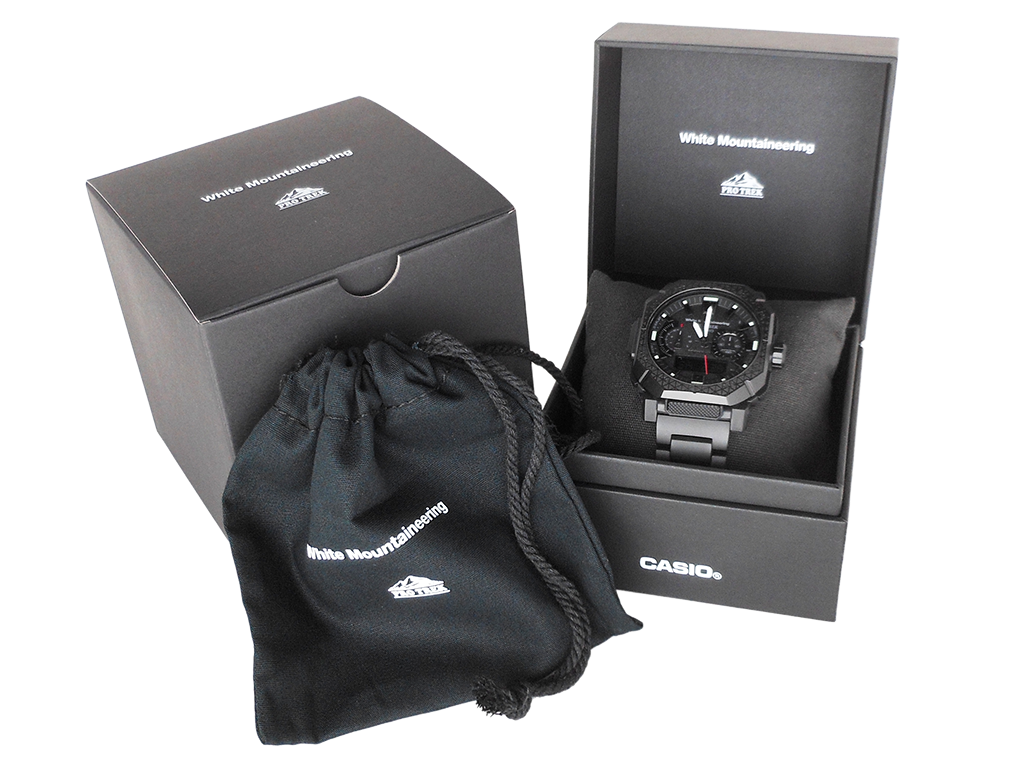 電波時計 日本・北米・ヨーロッパ・中国地域対応 MULTIBAND6・Bluetooth:スマートフォンと接続し時刻を自動修正・タフソーラー(ソーラー充電システム)・内面反射防止コーティングサファイアガラス・ねじロック式リューズ・表面加工:ブラックIP(ベゼル部)/ブラックIP(バンド部)・バンド装着可能サイズケースサイズ(縦×横×厚さ)50.8 × 45.8 × 14.9 mm・重さ120 g・ケース/ベゼル材質:樹脂(バイオマス)/ステンレススチール・バンド:メタルバンド(チタンムクバンド)ダブルロック/ワンプッシュ三つ折れ式中留・10気圧防水・耐低温仕様(-10℃)・センサー機能:方位計測機能:16方位・方位の角度(0~359°)を計測、方位連続計測(60秒)、北方位指針機能、ベアリングメモリー機能、自動水平補正機能、磁気偏角補正機能、方位補正機能・高度計測機能/相対高度計(計測範囲:-700~10,000m/1m単位)、高度メモリー(計測年月日・時刻・高度を最大30本マニュアルメモリー、自動記録データ:最高/ 最低高度、オート積算(上昇/ 下降)メモリー)、高度傾向グラフ、高度差インジケーター(±100m /±1000m)、計測間隔設定機能(5秒/2分毎)※最初の3分間のみ1秒毎・気圧計測機能(計測範囲:260~1,100hPa)、気圧傾向グラフ(過去20時間分を表示)、気圧差インジケーター(±10hPa)、気圧傾向インフォメーションアラーム(特徴的な気圧の変化が起こった場合に矢印と報音でお知らせします)※気圧傾向グラフは2分毎の計測に変更することができます。その際は過去20分です。・温度計測機能(計測範囲:-10~60℃、0.1℃単位)・モバイルリンク機能(対応携帯電話とのBluetooth通信による機能連動)・「CASIO WATCHES」対応アプリ連携機能・自動時刻修正・簡単時計設定・ワールドタイム約300都市・ロケーションインジケーター・ロケーションメモリー・ルートログ・モードカスタマイズ・自動高度補正・携帯電話探索・バンド装着可能サイズ:150~205mm・時計機能:ワールドタイム:世界55都市(38タイムゾーン、サマータイム設定機能付き)+UTC(協定世界時)の時刻表示、ホームタイムの都市入替機能、UTCダイレクト呼出機能・日の出・日の入時刻表示・ストップウオッチ(1/100秒、24時間計、スプリット付き)・タイマー(セット単位:1分、最大セット:60分、1秒単位で計測)・時刻アラーム5本・時報・ダブルLEDライト:文字板用LEDライト(フルオートライト、スーパーイルミネーター、残照機能、残照時間切替(1.5秒/3秒)付き)、LCD部用LEDバックライト(フルオートライト、スーパーイルミネーター、残照機能、残照時間切替(1.5秒/3秒)付き)・ライトカラーLED:ホワイト・フルオートカレンダー・操作音ON/OFF切替機能・針位置自動補正機能・パワーセービング機能(暗所では一定時間が経過すると表示を消して節電します)・バッテリーインジケーター表示・駆動時間:フル充電時からソーラー発電無しの状態での駆動時間 機能使用の場合:約6ヵ月 パワーセービング状態の場合:約24ヵ月※電波受信が行われない場合や、スマートフォンと連携しない場合は、通常のクオーツ精度(平均月差±15秒)で動作します。・12/24時間制表示切替・針退避機能(手動、自動(高度、気圧、温度計測時))・電波受信機能:自動受信(最大6回/日)(中国電波は最大5回/日)/手動受信、<日本>受信電波:JJY、周波数:40kHz/60kHz(福島/九州両局対応モデル)<北米地域>受信電波:WWVB、周波数:60kHz<ヨーロッパ地域>受信電波:MSF/DCF77、周波数:60kHz/77.5kHz<中国>受信電波:BPC、周波数:68.5kHz *ホームタイム設定を受信可能な都市に設定すると、都市に合わせた局を受信します。尚、時差は選択した都市またはタイムゾーンによって設定されます。・ホームタイム都市(受信機能対応都市)/受信電波:東京/日本の標準電波JJY40・JJY60 (ホノルル)、(アンカレジ)、ロサンゼルス、デンバー、シカゴ、ニューヨーク/アメリカの標準電波WWVB ロンドン、パリ、アテネ/イギリスの標準電波MSF・ドイツの標準電波DCF77 香港/中国の標準電波BPC ※( )内の各都市は条件が良ければ受信する場合もあります。
