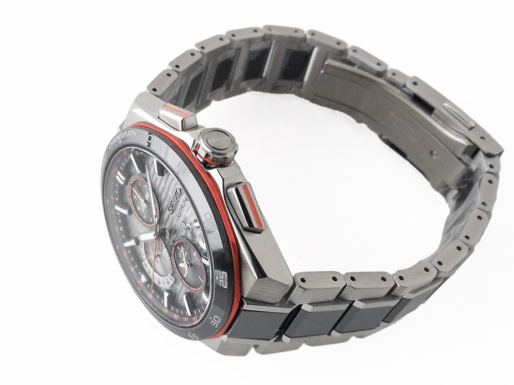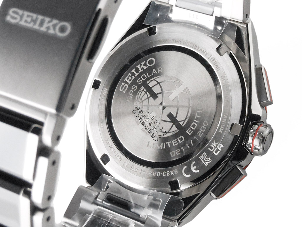 キャリバーNo.5X83・駆動方式:ソーラーGPS衛星電波修正・精度:非受信時平均月差±15秒・駆動期間:フル充電時約6ヶ月間 パワーセーブ時約2年・石数:14石・過充電防止機能・パワーセーブ機能・ストップウオッチ機能(1/20秒計測 12時間計)・パーペチュアルカレンダー機能(2100年2月28日まで)・ワールドタイム機能(38タイムゾーン)・デュアルタイム表示機能・曜日表示機能・パワーリザーブ表示機能・タイムトランスファー機能・衛星電波受信によるタイムゾーン修正機能・スーパースマートセンサー機能・捕捉衛星数表示機能・受信結果表示機能・DST(サマータイム)機能・受信オフ機能(機内モード)・針位置自動修正機能・ケース材質:純チタンケースとセラミックス 裏ぶた:純チタン・ケースサイズ:厚さ:13.4mm横:43.4mm縦:49.5mm・ガラス材質:デュアルカーブサファイア(スーパークリア コーティング)・ルミブライト(針・インデックス)・ワンプッシュ三つ折れ方式中留・腕周り長さ(最長)190.0mm・日常生活用強化防水(10気圧)・耐磁・重さ:123.0g・耐メタルアレルギー・スマートアジャスター機構つき中留・スクリューバック※実際の製品では、製造上の理由により、裏ぶたの向きが異なる場合があります。