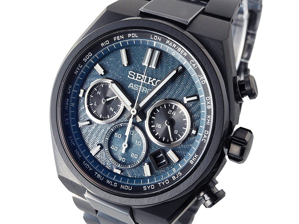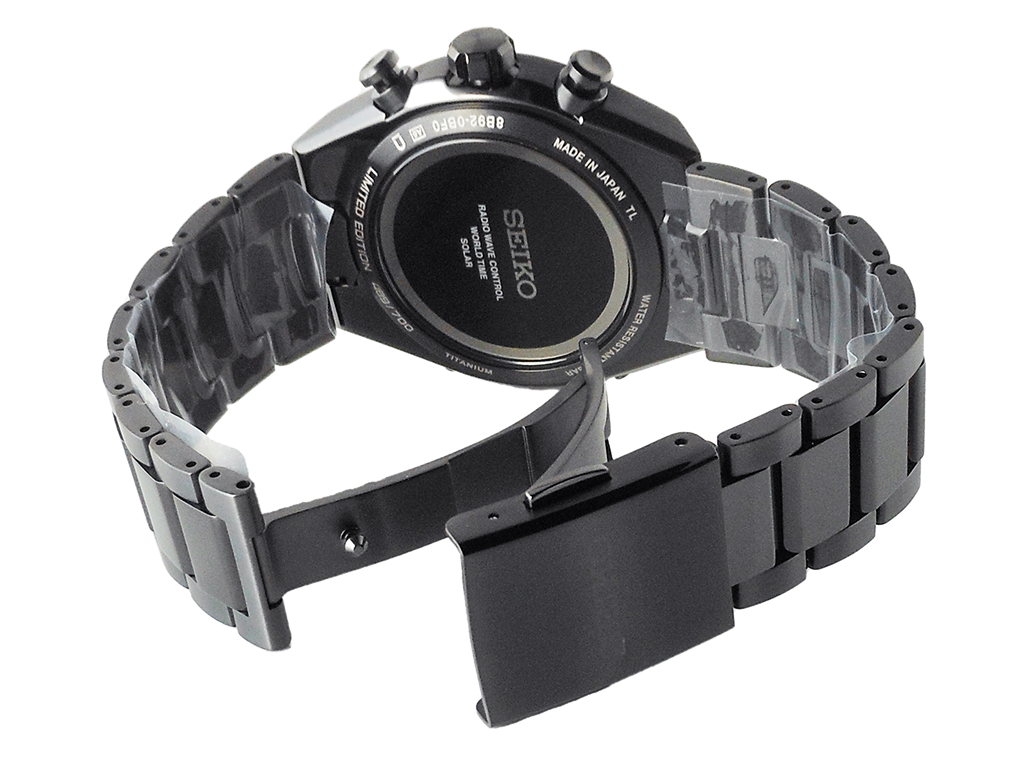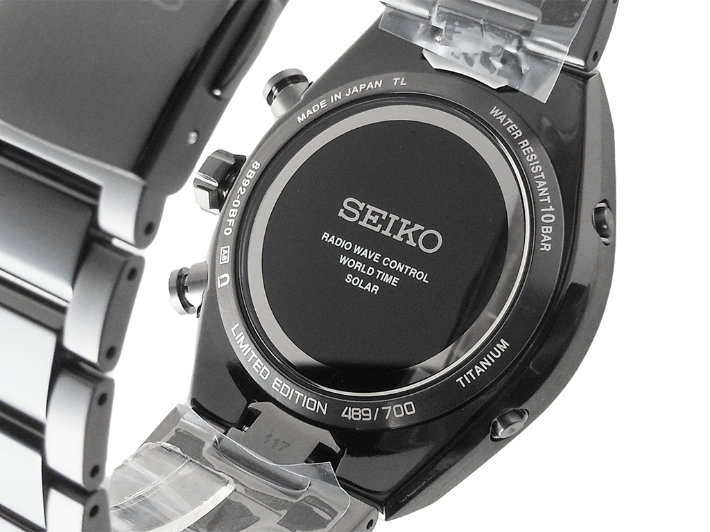 Cal.8B63・駆動方式:ソーラー電波修正(非受信時平均月差±15秒)・フル充電時約9ヶ月間/パワーセーブ時約2年・石数10石・過充電防止機能・即スタート機能・パワーセーブ機能・フルオートカレンダー機能(2099年12月31日まで)・ワールドタイム機能(25タイムゾーン)・デュアルタイム表示機能・レトログラード式曜日機構・自動受信機能・強制受信機能・受信結果表示機能・受信レベル表示機能・針位置自動修正機能・カレンダー(日付・曜日)機能つき・純チタンケース/バンド(裏ぶた:純チタンとガラス)・ケースサイズ:厚さ:10.6mm横:41.3mm縦:46.9mm・サファイアガラス(スーパークリア コーティング)・ルミブライト夜光(針・インデックス)・ワンプッシュ三つ折れ方式バンド中留(スマートアジャスター機構)・腕周り長さ(最長)188.0mm・日常生活用強化防水(10気圧)・耐磁・重さ90.0g・裏ぶた「LIMITED EDITION」表記・裏ぶたシリアルナンバー入り・ねじロック式りゅうず・耐メタルアレルギー・スマートアジャスター機構つき中留